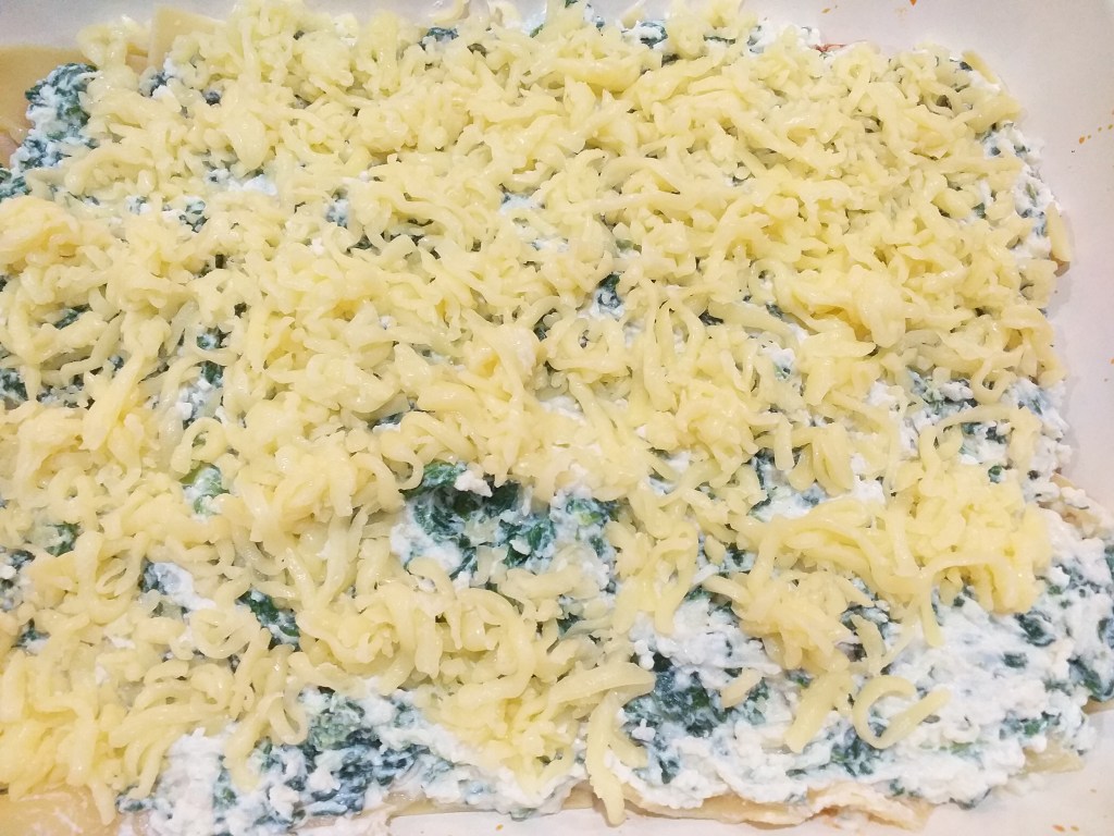 - Carefully spread the ricotta mixture over, then sprinkle with remaining mozzarella cheese.