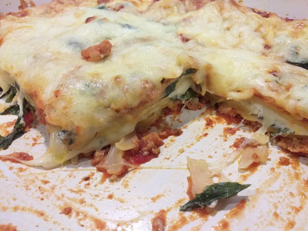 Rich and gooey from three types of cheese, but at the same time well-balanced with the addition of spinach and fresh sweet basil for the “greens”. I used canned traditional pasta sauce. But you can also use marinara or, for a more spicy kick, arrabbiata.