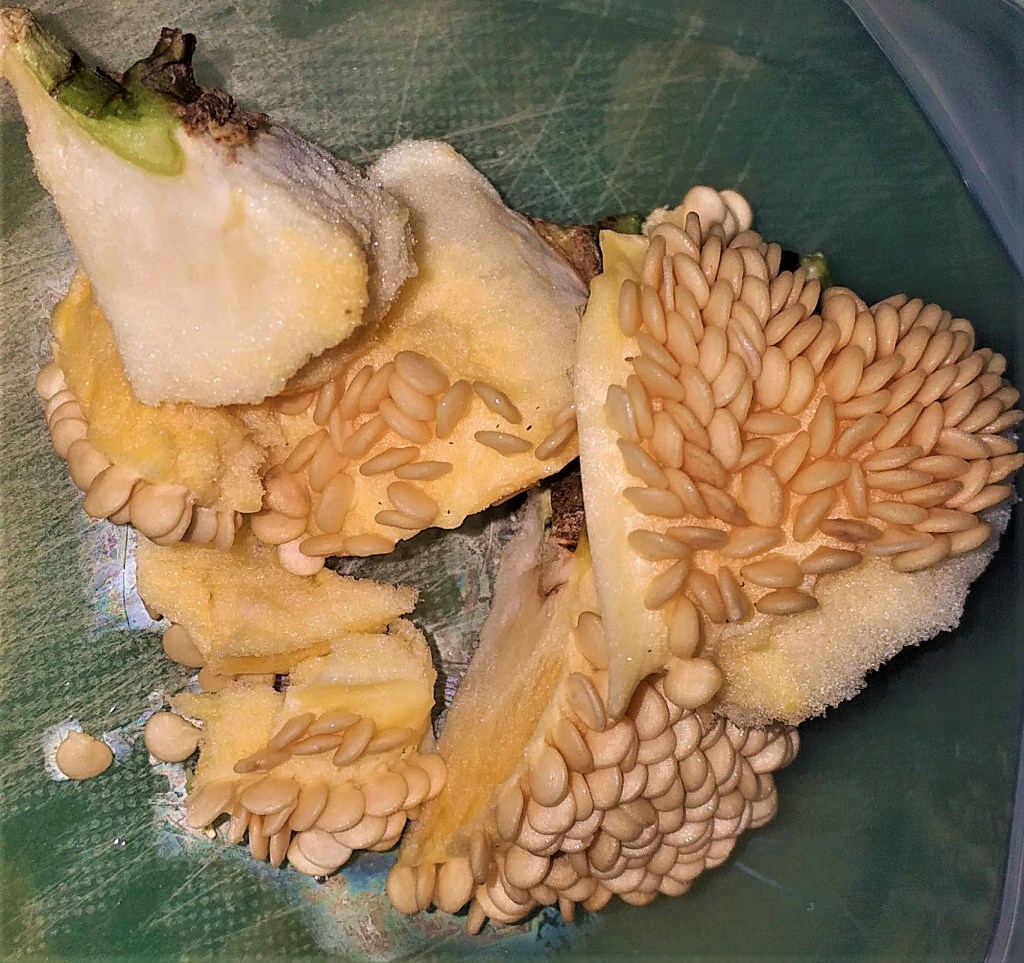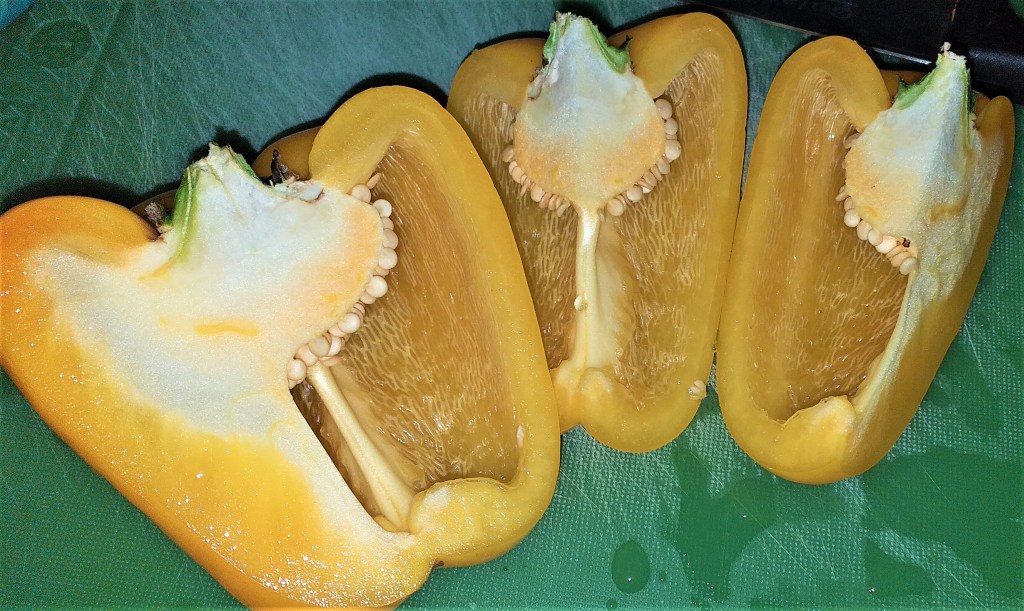 A bell pepper cut open to be used for cooking.Reserve the seeds. Since bell peppers seeds have a high rate of germination, you will probably only need a few.Fill a pot about four-fifths full with potting mix. Scatter a few seeds over it.Cover the seeds with about half a cm of potting mix, then spray with water to keep it moist. Young seedlings need water regularly — at least once a day.Bell pepper seedlings after about two weeks of planting. Nearly all of the seeds managed to germinate. The pots will get quite crowded when the plants grow bigger. After a few days, I would need to thin out the seedlings to allow the plants to grow well and not have to compete for nutrients and root space.